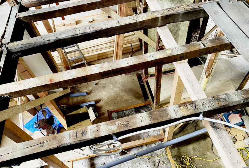私は1階で作業することが多いのですが、床板を剥がした状態の1階から2階を眺めると、本当に格好良い光景が目の前に広がります。何より開放感がすごい。新築では味わえない古風な渋み。こういう景色を見るたびに「この物件に出会えて良かった」と強く感じますし、より完成が楽しみになります。