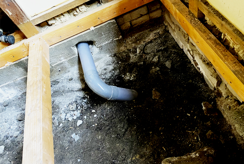 本日から「水道」屋さんが現場に合流しました。1階の床板を完成させる前に排水管を設置するためです。この古民家、解体してみてわかったのですが、所々で排水管から水漏れを起こしていました。もちろん排水管は地面の下を通っているので大きな問題にはならないのですが、建物にとっては決して良いことではありません。もちろん今回のリノベーションでは出来るだけ排水管に負担がかからないように工夫した設計が施されています。