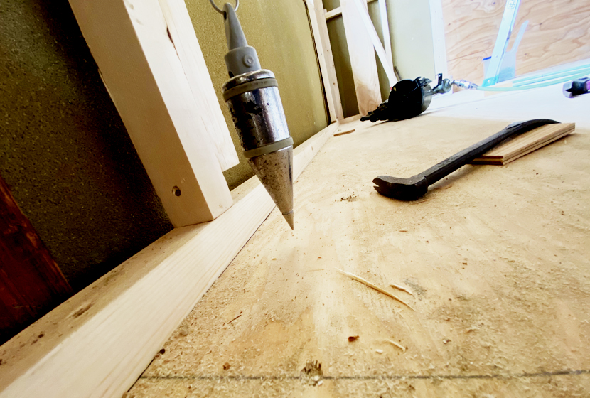 写真は「下げ振り」と言う工具で柱・壁などの垂直を見るための道具です。天井にから吊るした振り子のようなもので壁からの平行ラインを測るのですが、手法はかなりアナログです(笑) 「大工」さんから「1mm右」とか「2mm左」とかミリ単位で調整の指示が入るのですが、振り子の先はちょとした動作で動くのでミリ単位での微調整とか、どのくらい正確にできるか自分でも自信がありませんでした。しかも目算(笑)