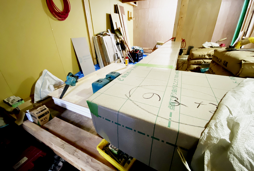 1階の店舗スペースも造作が進んでいます。今日はキッチンと客間を隔てるカウンターが完成しました。建物の構造の都合上、店舗スペースは入口が広く「大工」作業として搬入がしやすい場所なので、今は作業スペース兼材木置場として活用しています。なので十分な作業スペースが確保できないので、他の部屋と比べると進捗がスローです。ただこうやって、カウンターのような特殊なインフラが設備されると、「それが店舗だ」とわかりやすく視認化できるようになったと感じます。